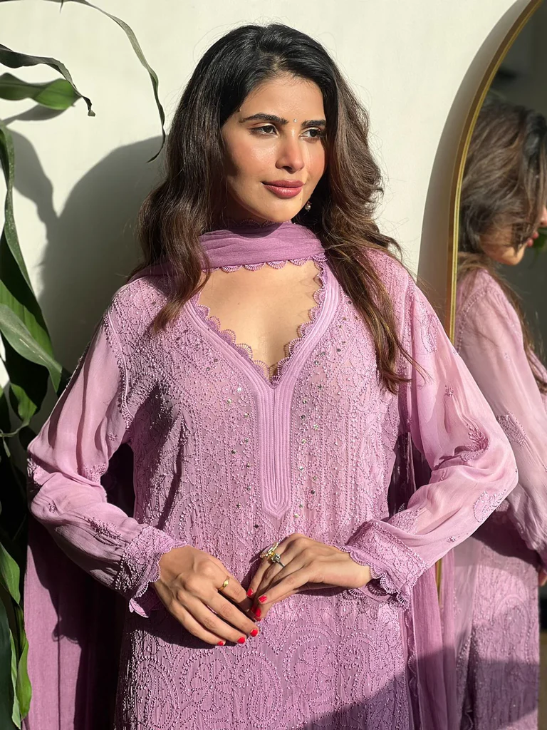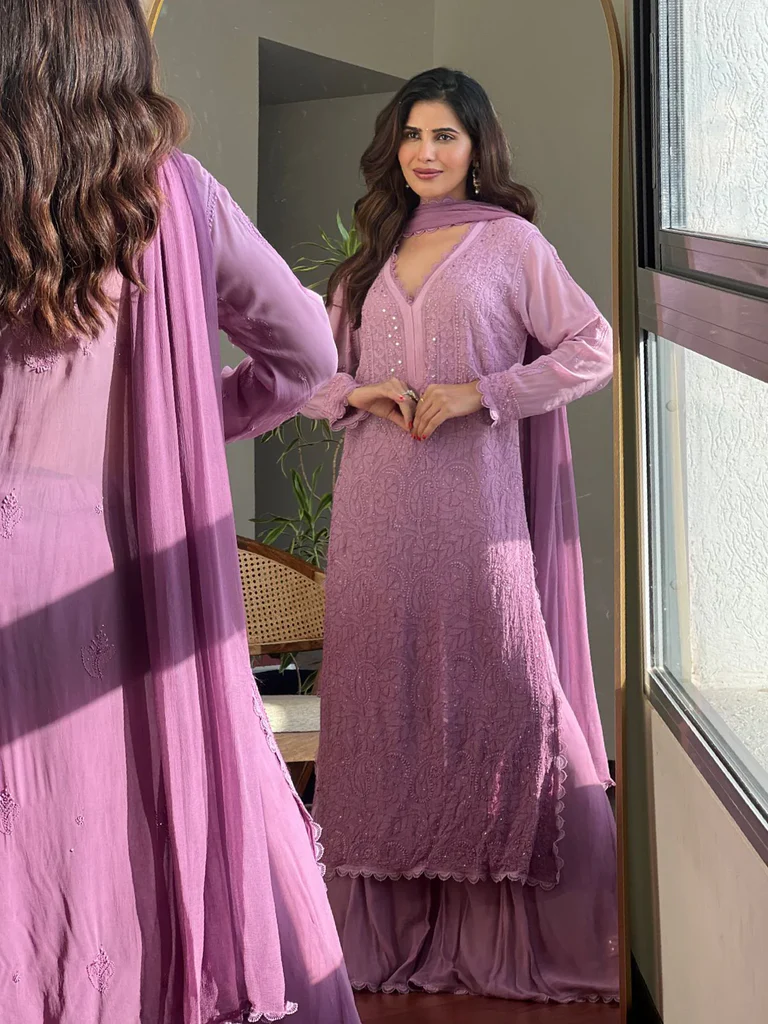 Be the first to review “Purple Viscose Georgette Silk Chikankari Kurta With Palazzo And Dupatta Set” Cancel reply